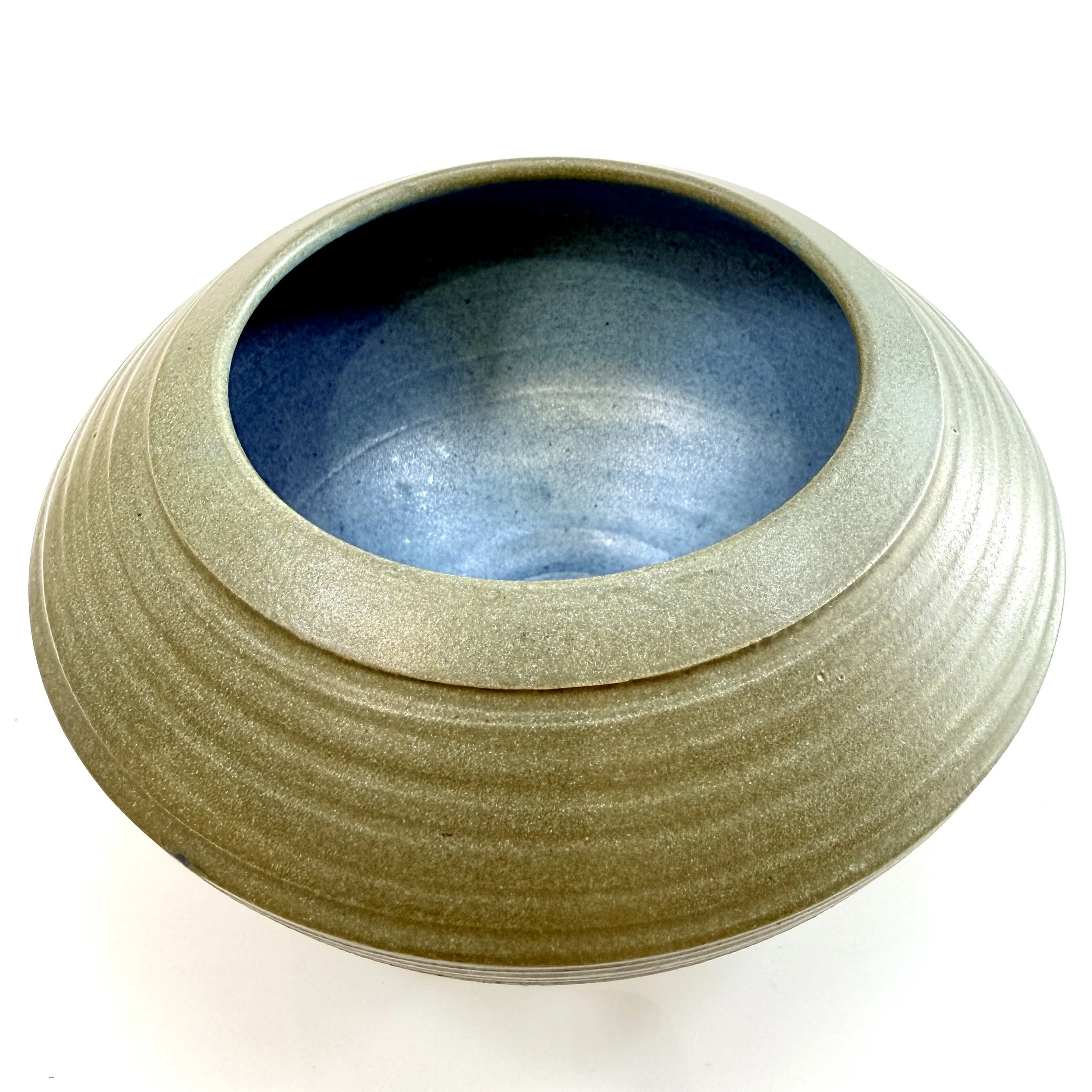 This vase features a beautifully ribbed, rounded form in matte olive green, contrasted by a deep glossy blue interior. The interplay of texture and colour gives the piece a calm, tactile presence, making it ideal as a sculptural accent or functional vessel.