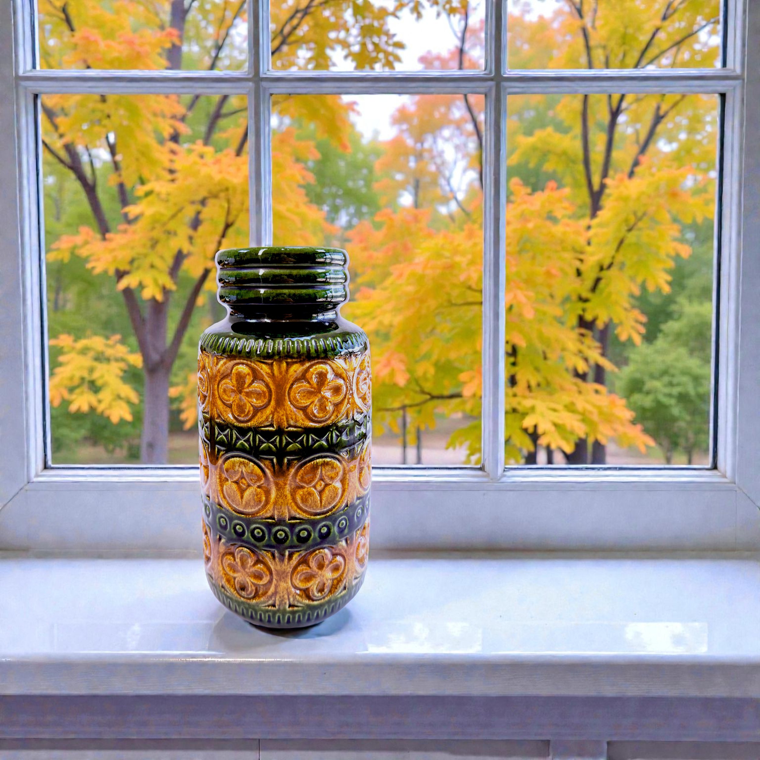 A vibrant mid-century West German pottery vase by Scheurich Keramik, model 289-27, marked W. Germany on the base. This piece features a richly glazed surface in mustard and olive tones, with embossed floral and geometric motifs arranged in horizontal bands. The ribbed neck and glossy finish add sculptural depth, making it a standout accent for retro interiors or collectors of 1960s–70s ceramics.